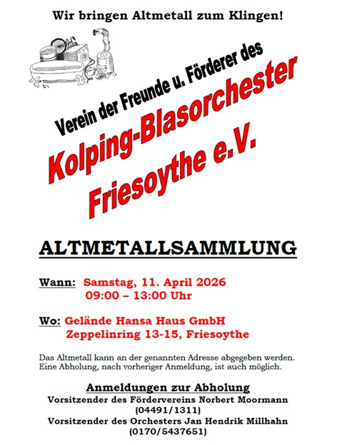 Der „Verein der Freunde und Förderer des Kolping-Blasorchesters Friesoythe e.V.“ führt gemeinsam mit dem Orchester eine Altmetall-/Schrottsammlung durch. Die Sammlung findet am Samstag den 11.04.2026 in der Zeit von 09:00 bis 13:00 Uhr statt. Die Erlöse dienen in diesem Jahr der Anschaffung neuer Instrumente. So wird beispielsweise jedem Kind bzw. Jugendlichen im Verein kostenlos ein Instrument zur Verfügung gestellt.