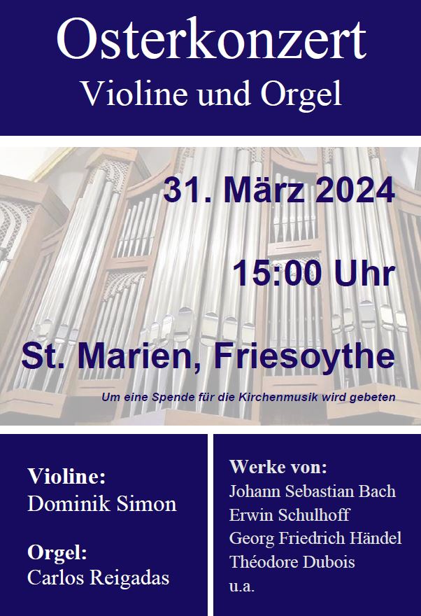 Sie sind herzlich eingeladen zu unserem feierlichen Osterkonzert am 31. März um 15:00 Uhr in St. Marien Friesoythe. Freuen Sie sich auf eine einzigartige Darbietung von Orgel und Violine. Dominik Simon, ein junger talentierter Geiger, der sein Studium in Münster erfolgreich abschließt, wird virtuose Werke von J. S. Bach, G. F. Händel, E. Schulhoff und anderen Komponisten zum Besten geben. Begleitet wird er von Carlos Reigadas, der festliche Orgelwerke zum Ostersonntag präsentieren wird. Lassen Sie sich dieses musikalische Erlebnis nicht entgehen!