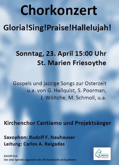 Kirchenchor und Projektchor Der Abschluss der Probenarbeit mit dem Projektchor bildet das Chorkonzert am 23. April um 15:00 Uhr in St. Marien. In diesem besonderen Chorkonzert erklingen Gospels und jazzige Chorwerke zur Osterzeit. Rudolf F. Nauhauser wird den Chor am Saxophon begleiten, aber auch Literatur für Saxophon und Klavier zu Gehör bringen.